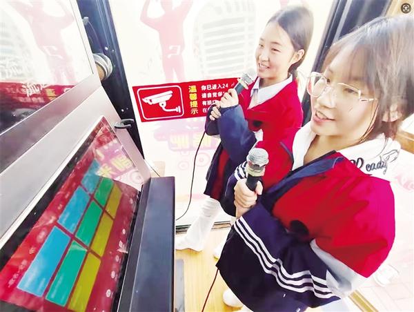 兩名女生利用課余時(shí)間在校園KTV唱吧內(nèi)放聲歌唱。
